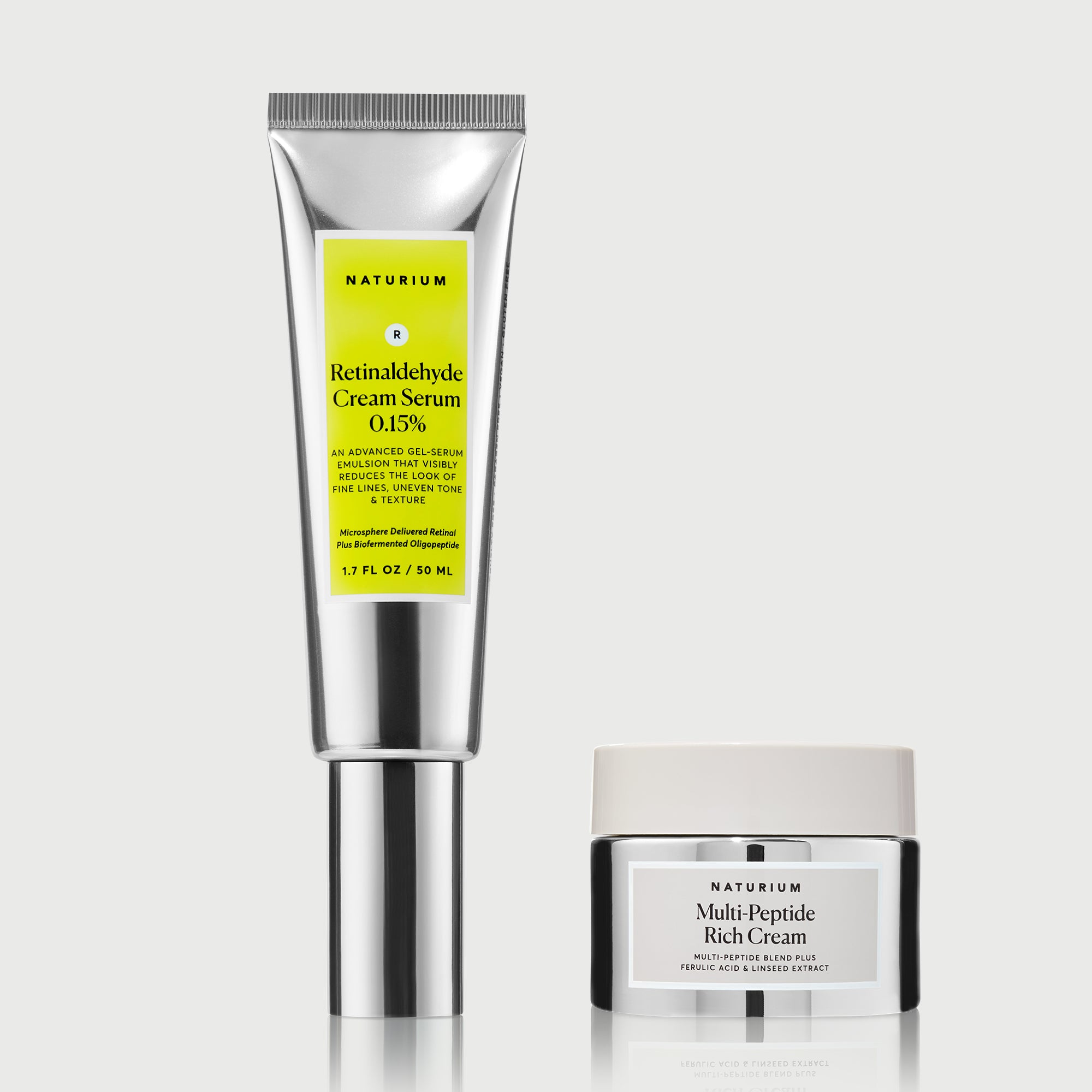 Our potent Retinaldehyde Cream Serum 0.15% and Multi-Peptide Rich Cream are the perfect pair to help reduce the appearance of dark spots, improve the look of fine lines and wrinkles and deeply hydrate for radiant, youthful-looking skin.