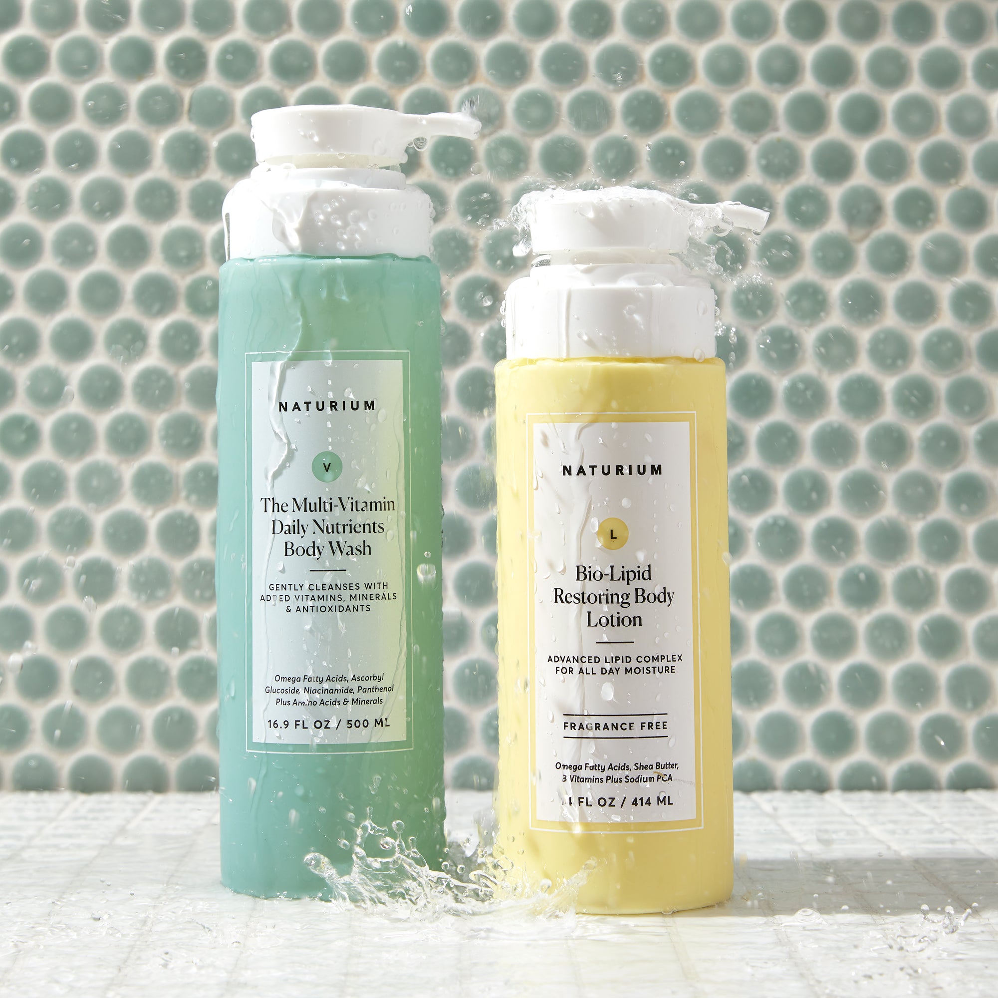 Our multi-vitamin body wash and replenishing body lotion for healthy and hydrated skin all over.