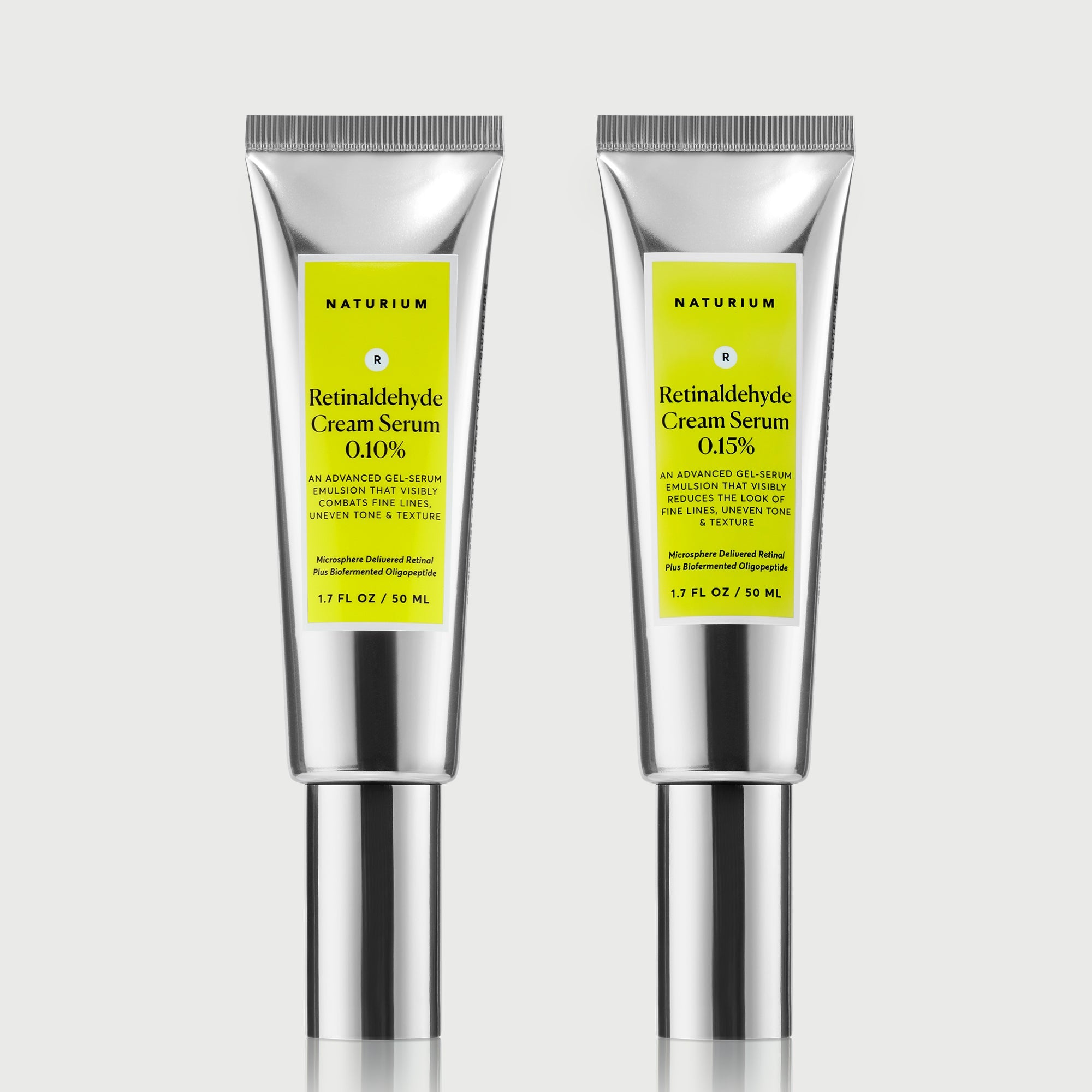 Power up your percentage. For intermediate Retinaldehyde users, this duo allows for alternating and phasing in to our most potent formulas at 0.10% and 0.15%.
