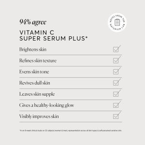 Our Vitamin C Super Serum Plus is clinically proven to brightens skin’s appearance and improve the look of fine lines and wrinkles plus skin tone and texture in just 8 weeks.*